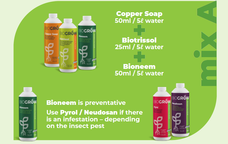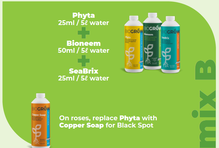 Always mix the products at their minimum dosage level as there is synergy between them which enhances their efficacy. Ideally, these mixes should be alternated on a fortnightly basis. Otherwise use Mix A every 10 to 14 days.